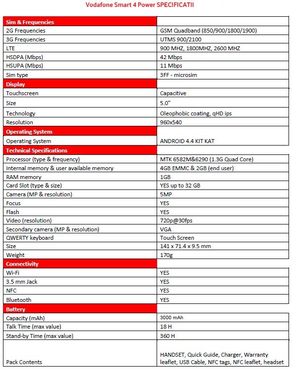 Alături de Vodafone Smart 4 Turbo a fost prezentat și Vodafone Smart 4 Power pe care-l consider a fi cu adevărat interesant. Prețul lui Vodafone Smart 4 Power este de 189 euro, fără semnarea unui contract și 29 euro cu Red 19 pe 2 ani de zile.