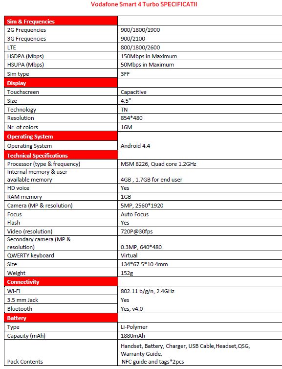 Care sunt datele hardware pentru Vodafone Smart 4 Turbo?