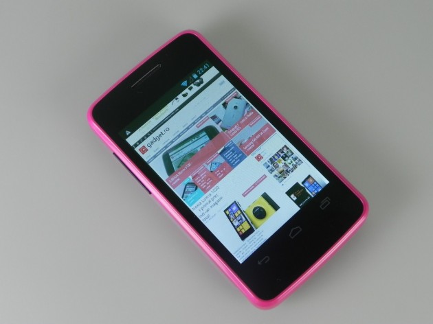 În cutie dați de telefon, bateria de 1400 mAh, cablu microUSB – USB 2.0, încărcător pe USB 2.0, manual de instrucțiuni, căști pe jack de 3.5 mm. Sample-ul primit la review este pe roz și aș zice că se pretează pentru publicul feminin.