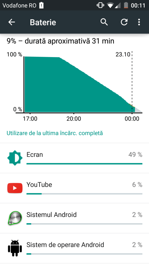 Vodafone Smart Ultra 6 a reprezentat o surpriză plăcută și din acest punct de vedere. Cu luminozitatea ecranului la 50% sau setată pe Auto, este destul de greu să epuizezi bateria în mai puțin de 12 – 14 ore. Cu o utilizare medie, poți trece destul de ușor și în cea de-a doua zi fără să ajungi la priză.