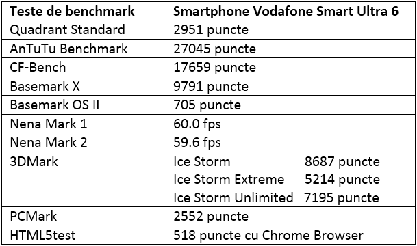 În tabelul de mai jos aveți toate rezultatele din testele de benchmark la care a fost supus Vodafone Smart Ultra 6: