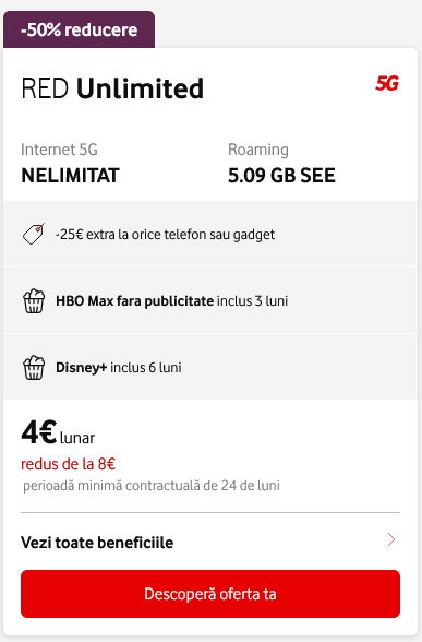 Practic, cu noul RED Unlimited primim totul nelimitat în România, cât şi acces gratuit pentru o anumită perioadă de timp pe platformele de streaming video HBO Max si Disney+.
