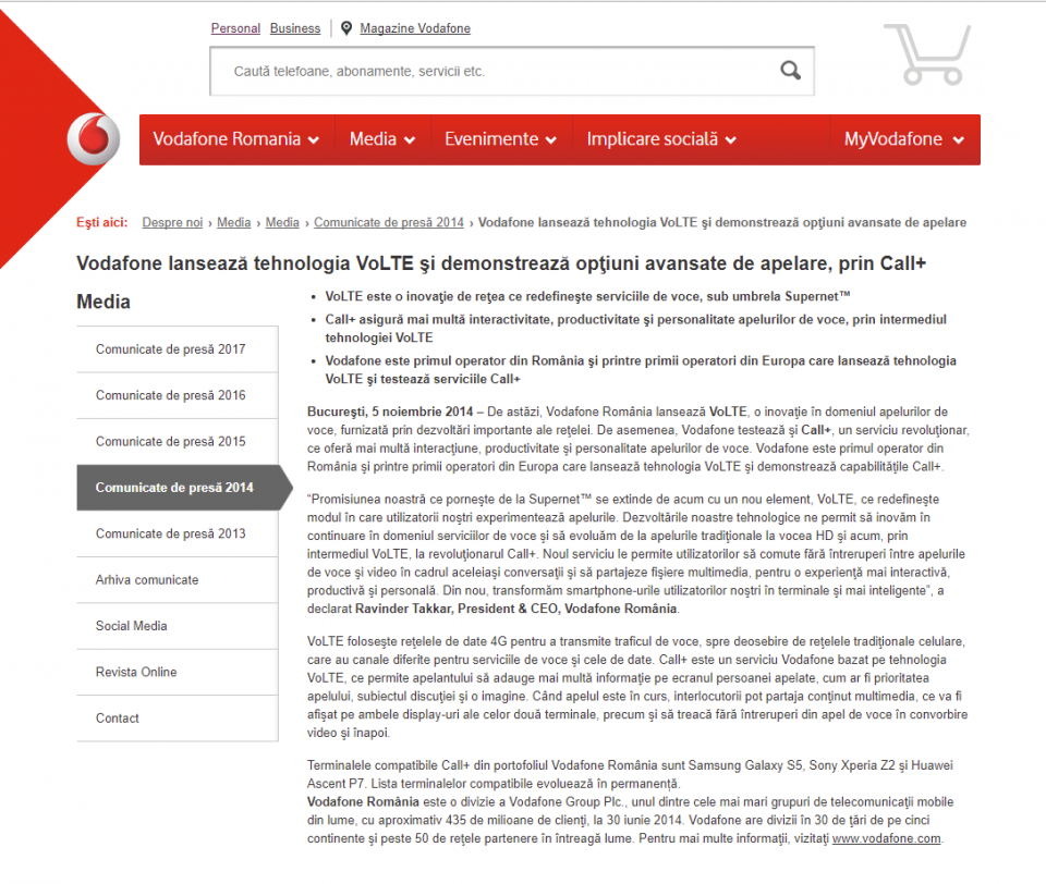 Am fost la evenimentul Vodafone pentru VoLTE și Call+. Îmi amintesc când CEO-ul Ravinder Takkar a făcut un apel către Simona Halep. Haideți să vedem comunicatul ce și acum îl găsiți pe site: