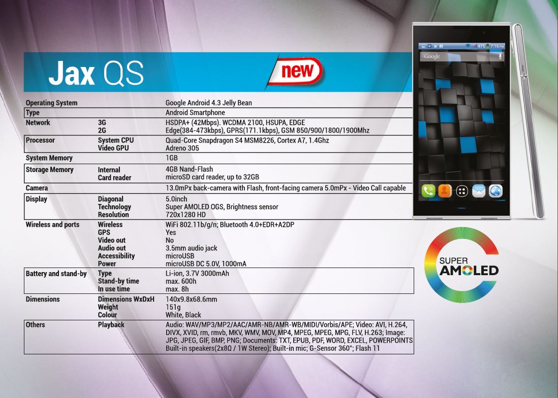 Are specificațiile lui Motorola Moto G la capitolul hardware, dar include display de 5 inch, cameră de 13 Megapixeli și frontală de 5 Mgpx, baterie de 3000 mAh ce, teoretic, livrează o autonomie destul de bună. La prețul corect aș spune că Vonino Jax QS ar putea fi un succes comercial.