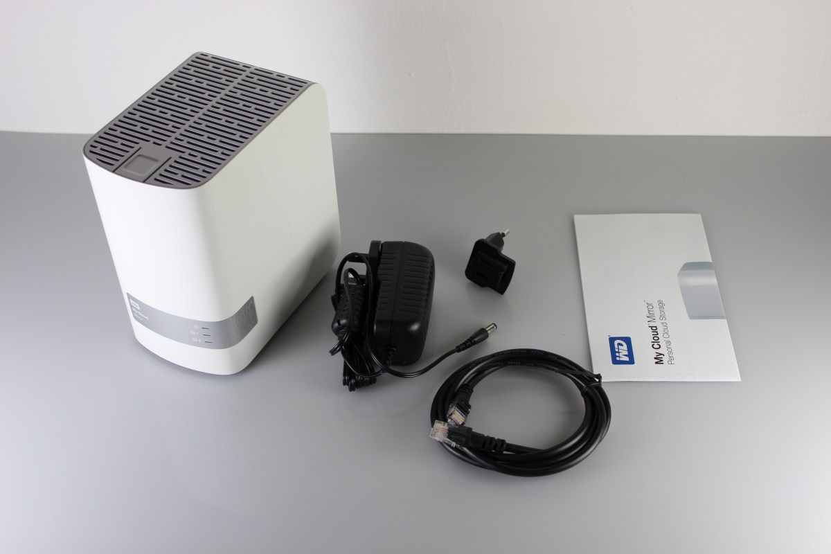 În pachet dați de My Cloud Mirror, cablu ethernet cu RJ-45 la ambele capete, încărcător și manual de utilizare. Arată ca un HDD extern over-size. La interior sunt 2 HDD-ul a câte 2 TB, de aici și capacitatea de stocare de 4 TB.