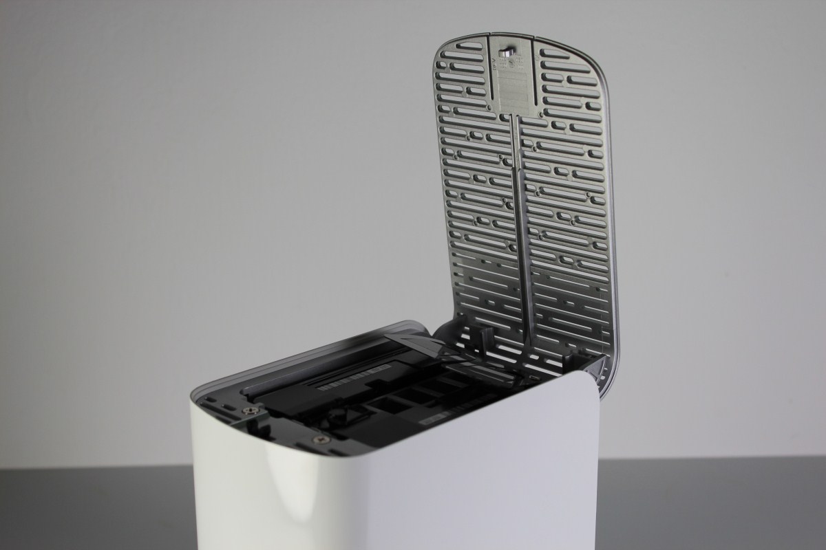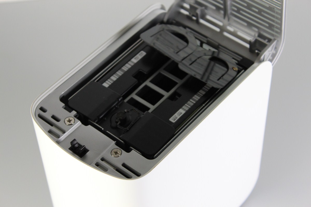 Am remarcat câte de ușor ai acces la cele 2 HDD, apeși în partea superioară pe margine și capacul sare ușor în sus. HDD-urile pot fi scoase din locașurile lor, rapid și fără nicio problemă. Oricând poți alege să folosești alte HDD-uri față de cele incluse în pachet etc.