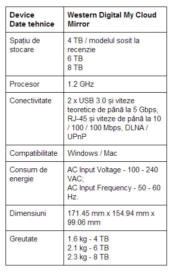 Încep cu câteva detalii tehnice pentru Western Digital My Cloud Mirror: