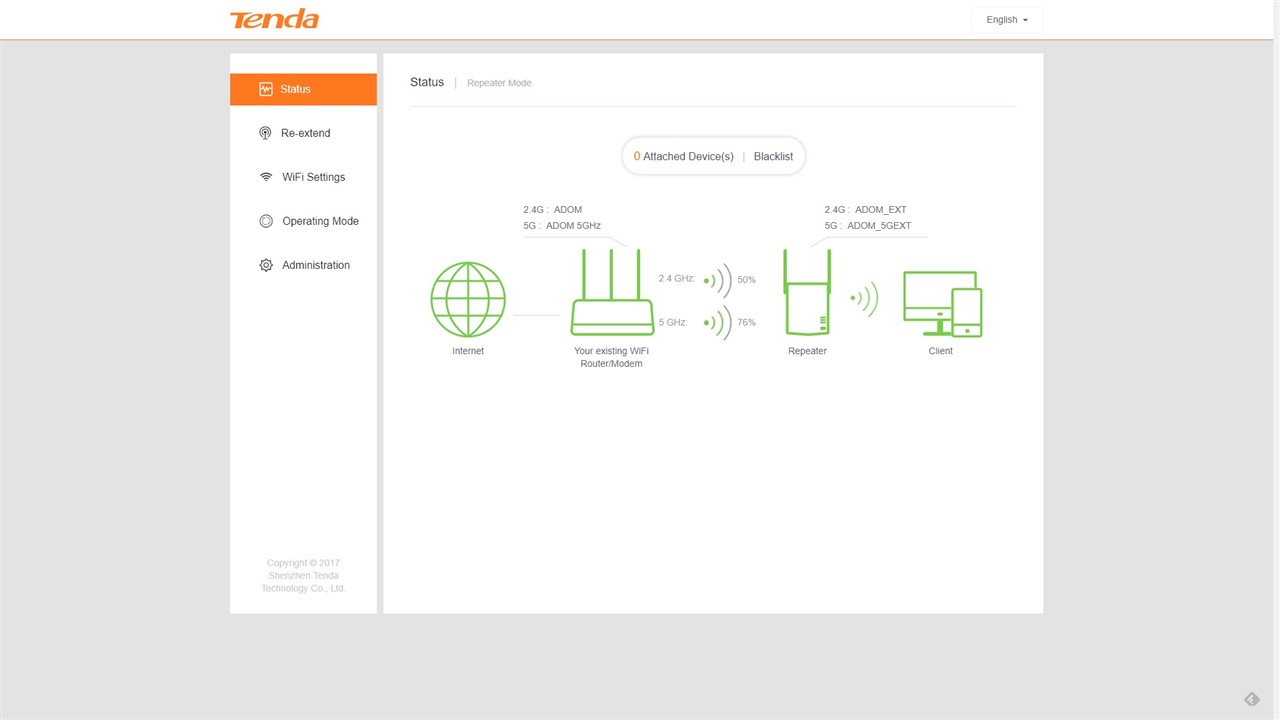 După ce ai parcurs pașii de instalare, poți muta repeater-ul acolo unde ai nevoie de un semnal Wi-Fi mai puternic, acolo unde cel pe care router-ul tău ți-l oferă este prea slab. Totuși, nu te poți duce prea departe cu Tenda A18 față de router. Pentru a te ajuta să nu depășești distanța de preluare optimă a semnalului Wi-Fi de la router, Tenda A18 este prevăzut cu un LED (Signal – primul de sus) care se aprinde albastru atunci când semnalul este optim și roșu atunci când ești prea departe de router. De pe pagina de setări ale dispozitivului poți vedea mai exact care este puterea semnalului venit de la router, atât pe 2.4 GHz, cât și pe 5 GHz și poți regla poziția antenelor de pe repeater în așa fel încât să prinzi cel mai bun semnal Wi-Fi de la router, fără a mișca repeater-ul. Doar câteva grade de reglare a antenelor pot aduce o diferență și de 10 – 12%.