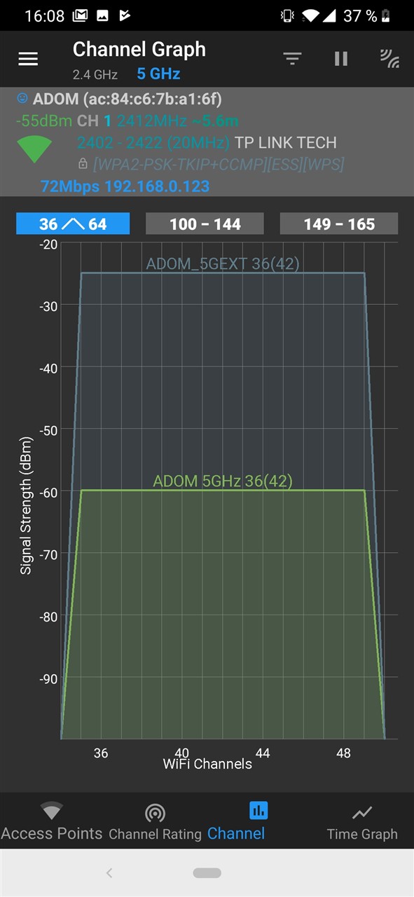 Pentru a vă arata mai exact care este motivul pentru care ai nevoie de un repeater precum Tenda A18, am instalat și o aplicație de Android care măsoară puterea semnalului Wi-Fi. În capturile de ecran puteți observa că există o diferență semnificativă a puterii semnalului dat de router (ADOM și ADOM 5GHz) și cea oferită de repeaterul Tenda A18 (ADOM_EXT și ADOM_5GEXT), la circa 7 metri depărtare de router, cu un perete din gips-carton între cele două dispozitive Wi-Fi: