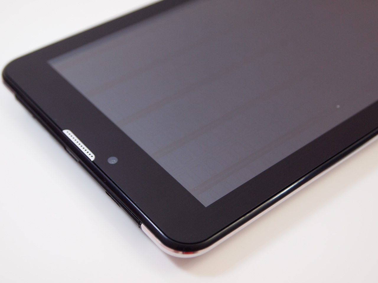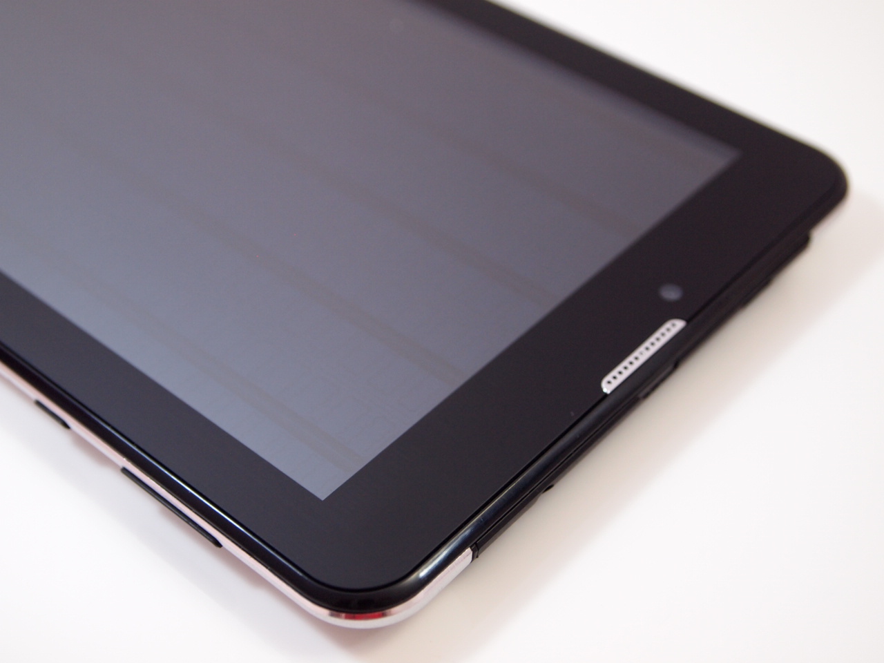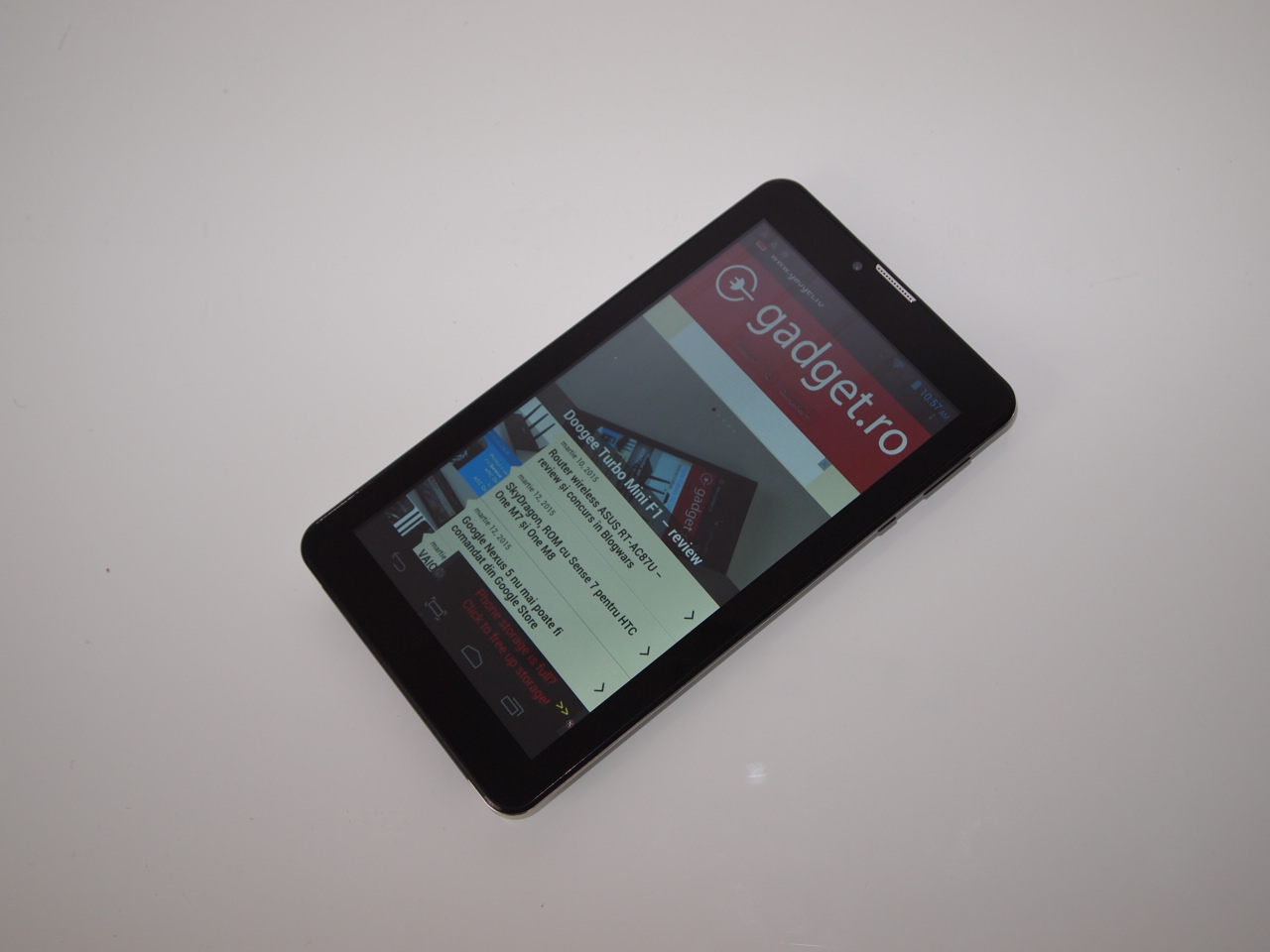 În afară de metalul folosit la construcție, tableta nu mai iese cu nimic în evidență. Partea din față, în afară de display și grila difuzorului pentru apeluri, nu ne mai atrage atenția cu niciun element. Nu există butoane capacitive la baza ecranului, acestea fiind de tip touch butons.