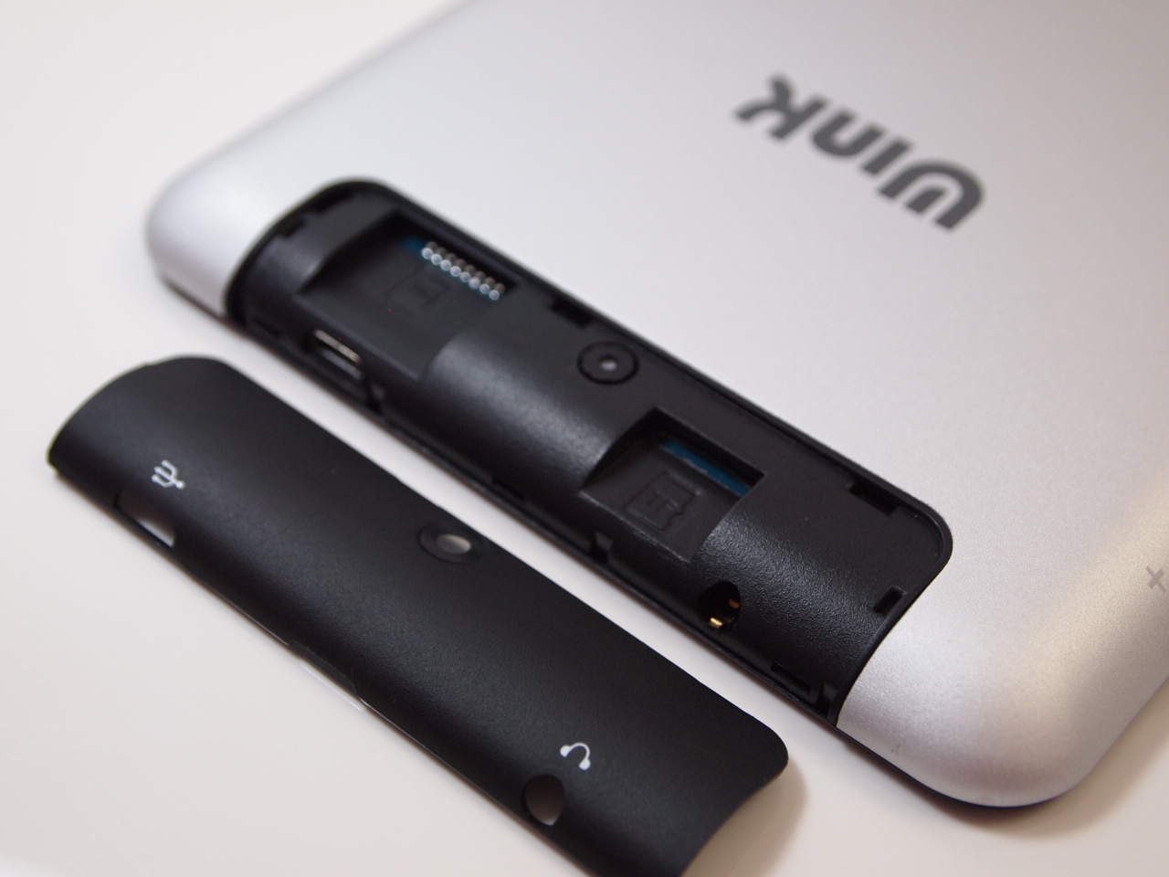 Aici găsim, să spunem, elementul definitoriu pentru Wink Connect 3G. După cum v-am anunțat deja, tableta este una de tip dual sim și acceptă două cartele de dimensiuni normale. Ele se introduc după ce desfacem capacul din plastic din partea de sus a dispozitivului. Sloturile sunt așezate unul sub celălalt, așa că trebuie avută puțină grijă când introducem cartelele.