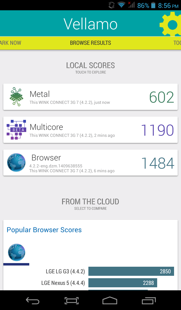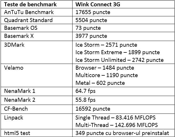 Wink Connect 3G a trecut prin obișnuitele teste de benchmark, iar apoi am structurat rezultatele în tabelul de mai jos: