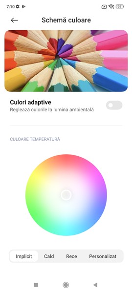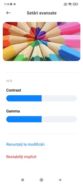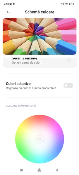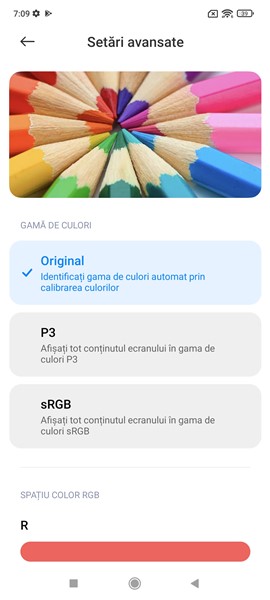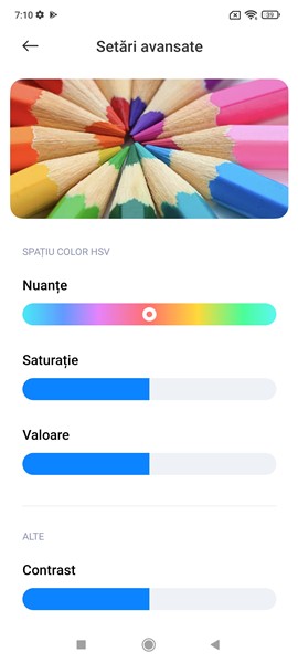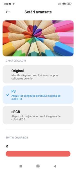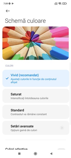 La schema de culoare poți alege între Vivid, Saturat, Standard și Setări avansate. La Setări avansate veți găsi Original, DCI-P3 și sRGB + opțiunea în a seta nuanțele HSV, saturația, contrastul etc. De fapt, cred că niciun smartphone testat până acum nu mi-a dat atâtea elemente de customizare. Îți reglezi ecranul după bunul plac. Eu am fost ușor ignorant și l-am ținut pe Vivid, 120Hz și luminozitate automată.