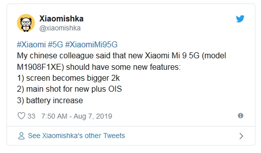 Se pare că Xiaomi pregăteşte şi o versiune 5G a acestui device, una uşor upgradată. Cele mai recente zvonuri susţin că Xiaomi Mi 9 5G va include pe lângă compatibilitatea cu tehnologia 5G şi un display cu rezoluţie 2K, cât şi cel mai puternic procesor al momentului: Qualcomm Snapdragon 855 Plus.