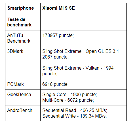 Rezultatele obținute de Xiaomi Mi 9 SE cu Qualcomm Snapdragon 712 le-am notat în tabel. Sunt rezultate bune ce relevă un smartphone cu suficient de multă putere de procesare oferită la pachet.
