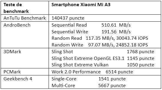 Așa cum vă spuneam mai sus, Xiaomi Mi A3 integrează un chipset foarte performant, ce în combinație cu ecranul 720p aduce rezultate foarte bune în jocuri și deci și în testele sintetice ce pun presiune pe GPU. La fel de bine se descurcă Xiaomi Mi A3 și pe partea de stocare, unde memoria internă de tip UFS 2.1 produce rezultate execelente în testele ce solicită această componentă: