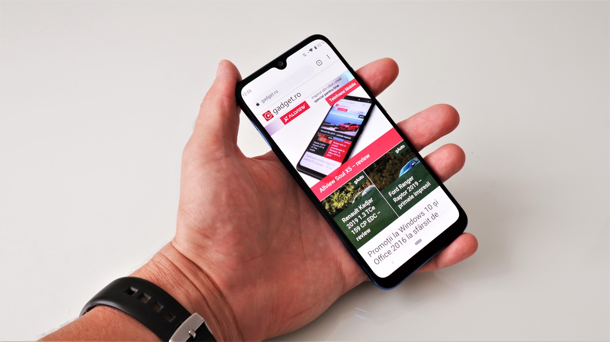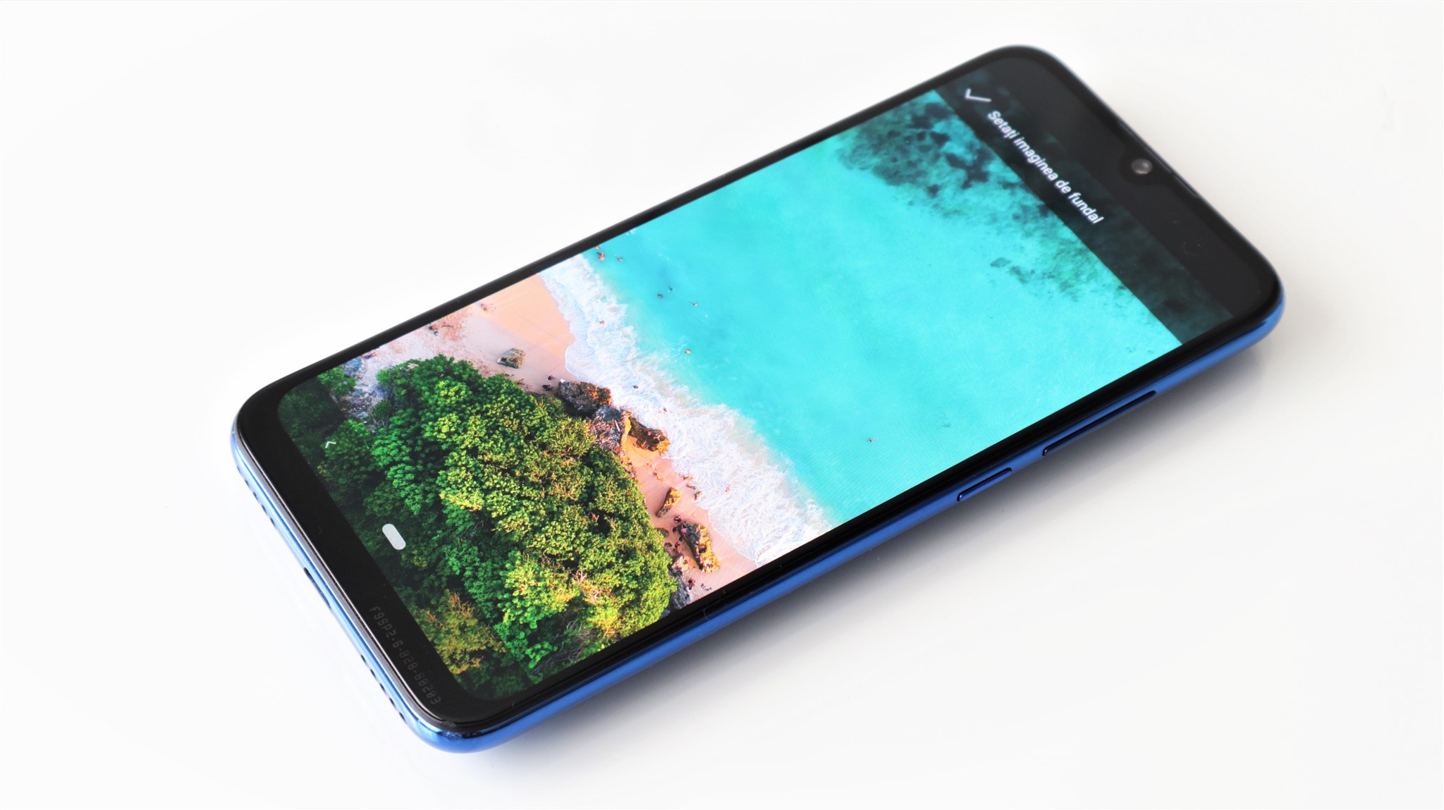 Ecranul cu breton tip picătură de apă se întinde pe o mare parte din suprafața frontală. Raportul între display și corp este de puțin peste 80 de procente. Marginile sunt destul de înguste în jurul ecranului, doar cea de jos este mai lată, însă mie nu mi s-a părut ceva de speriat.