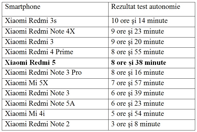 În testul specific Gadget.ro, în care rulăm continuu playlist-ul Unboxing de pe canalul de YouTube al site-ului, cu luminozitatea ecranului la maximum, prin conexiune Wi-Fi, Xiaomi Redmi 5 a rezistat 8 ore și 38 minute de la o baterie încărcată la 100% și până la 5% din capacitate.