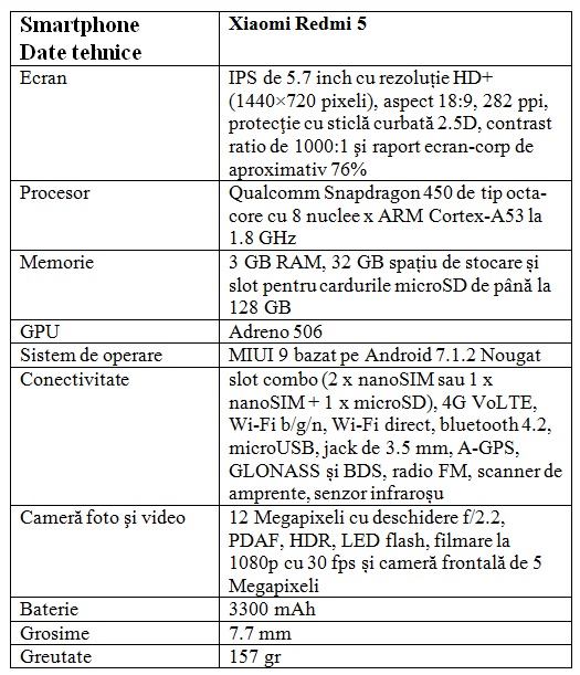 Acest smartphone este disponibil în mai multe configuraţii: 2 / 3 / 4 GB RAM, 16 / 32 GB spaţiu de stocare şi MIUI Global / chinezesc şi în mai multe culori: negru, auriu, roz auriu sau albastru. Noi am primit în teste un Xiaomi Redmi 5 pe negru cu 3 GB RAM, 32 GB spaţiu de stocare şi MIUI Global. Din ce am înţeles această versiune ar fi cea mai bine vândută în afara Chinei.