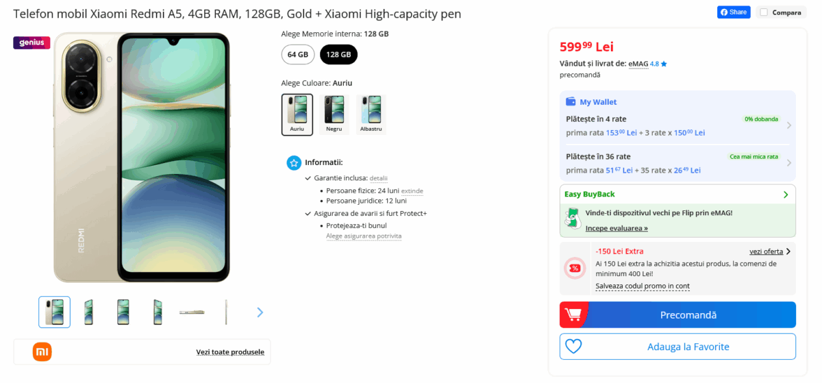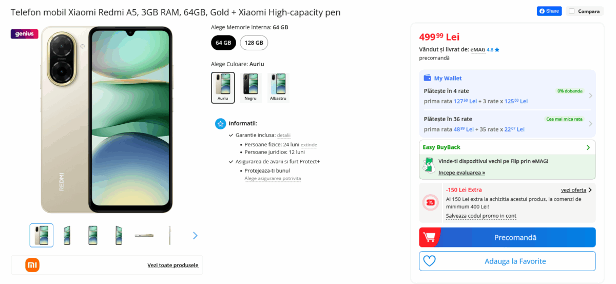 Acesta a intrat în etapa de precomandă, una care vine cu o surpriză interesantă: o reducere de 150 de lei suplimentară aplicată preţului standard prin intermediul codului cupon „redmi”. Oferta este valabilă la eMAG, iar costul final de achiziţie iese foarte mic: