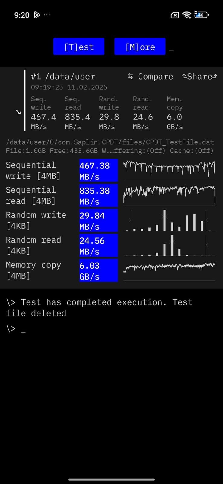 | CPDT Bench | Sequential Write – 467.38 MB/s; Sequential read – 835.38 MB/s; Random Write – 29.84 MB/s; Random Read – 24.56 MB/s; Memory copy – 6.03 MB/s; |