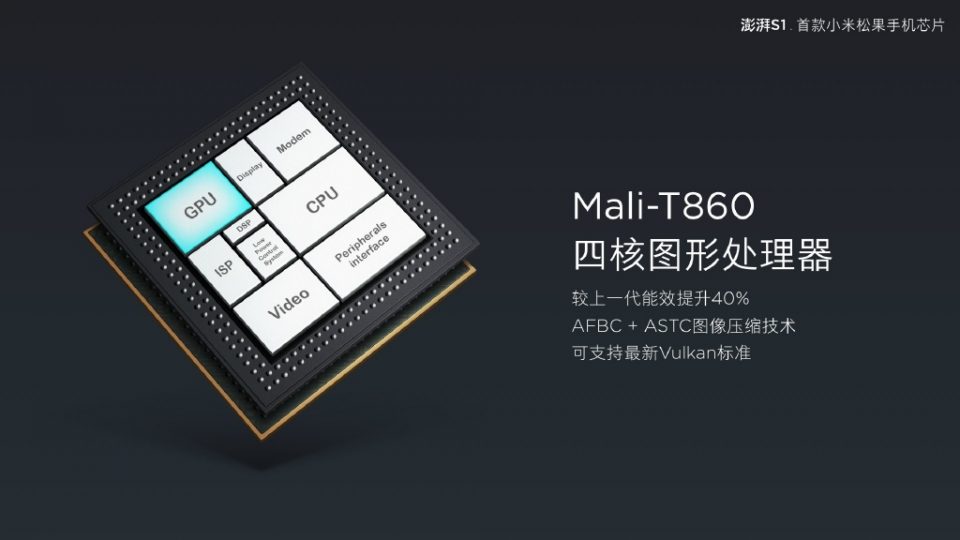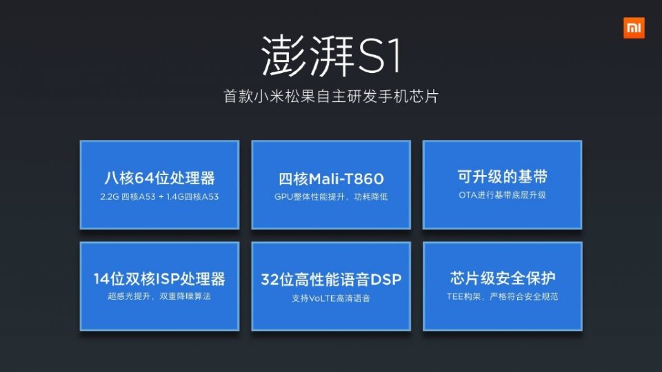 Xiaomi Surge S1 este un procesor octa-core destul de puternic fiind bazat pe arhitectură big.LITTLE, include 4 nuclee Cortex-A53 tactate la 2.2 GHz şi 4 nuclee Cortex-A53 tactate la 1.4 GHz, utilizează Mali-T860MP4 ca GPU şi este construit pe un proces HPC+ de 28 nm. Xiaomi Surge S1 oferă suport pentru tehnologiile de  comprimare a imaginii AFBC şi ASTC, VoLTE, 14-bit dual ISP pentru îmbunătăţirea calităţii imaginilor realizate noaptea, permite implementarea încărcării rapide la 9V/2A şi include securitate proprie ce este upgradabilă OTA (procesorul conţine modalităţi de a preveni scurgerea de informaţii).