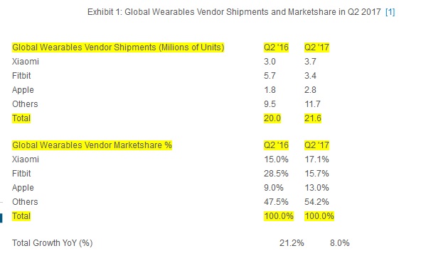 Xiaomi a crescut foarte mult pe partea de dispozitive purtabile şi a ajuns numărul 1 la nivel mondial. Conform companiei de cercetare Strategy Analytics în cel de-al doilea trimestru din 2017 au fost comercializate aproximativ 21.6 milioane de astfel de gadget-uri, top 3-ul fiind format din: