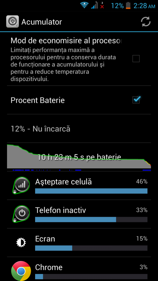 Bateria de 1800 mAh se dovedește insuficientă spre a livra necesarul de energie cerut de display-ul de 5 inch + MediaTek-ul octa-core. Autonomia este de-a dreptul dezamăgitoare. În 3 – 4 ore pe utilizare mai intensivă ai ajuns la sub 20%. Neapărat trebuie dat pe luminozitate la 50%, fără sincronizări în fundal și așa te mai poți duce spre 3 sferturi de zi.