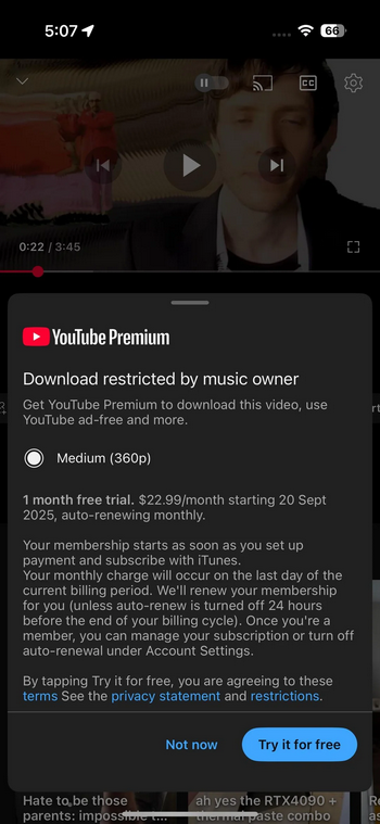 Se pare totuşi că YouTube testează zilele acestea opţiunea de a permite descărcarea de clipuri video şi celor fără abonament Premium. Unii utilizatori au descoperit butonul de „Download” ce le permite să descarce offline la calitate 144p şi 360p. Dacă prima este aproape inutilizabilă (se pierd foarte multe detalii), a doua este vechea rezoluţie SD (la standardele de azi rămâne o calitate mediocră, însă pentru o scurtă perioadă de timp te-ai putea readapta la ea, mai ales pe ecrane mici unde se vede ok-ish).