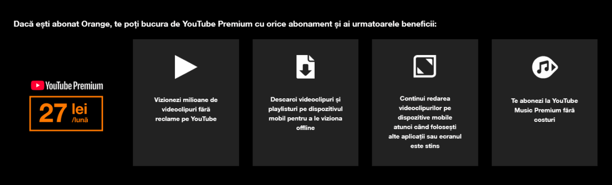 Actualii abonaţi se pot bucura de YouTube Premium la un preţ redus la 27 lei / lună. În standard YouTube Premium Individual costă 29 lei / lună, deci ca abonat Orange plăteşti cu 2 lei / lună mai puţin.