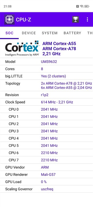 | Procesor | Unisoc T8300 pe 6nm, octa-core cu 2 x 2.2 GHz Cortex-A78 + 6 x 2.0 GHz Cortex-A55 |