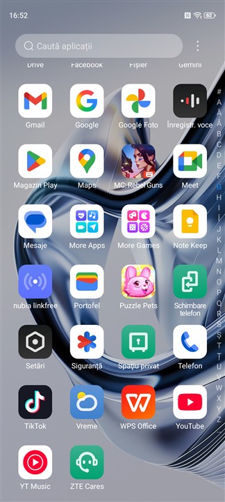 Ca aplicații preinstalate, din nou surpriză. Mă așteptam să fie mai multe puse de-a gata de către ZTE, dar, dacă nu le bifezi în timpul procesului de configurare inițială, nu vei descoperi ulterior decât Asphalt Nitro 2, Block Blast, Booking.com, Curățare, Dialogue translation, Facebook, MC: Rebel Guns, More Apps, More Games, nubia linkfree, Puzzle pets, Schimbare telefon, TikTok, WPS Office și ZTE Cares. Pot părea multe, dar de fapt sertarul cu toate aplicațiile este suficient de aerisit, să spunem.