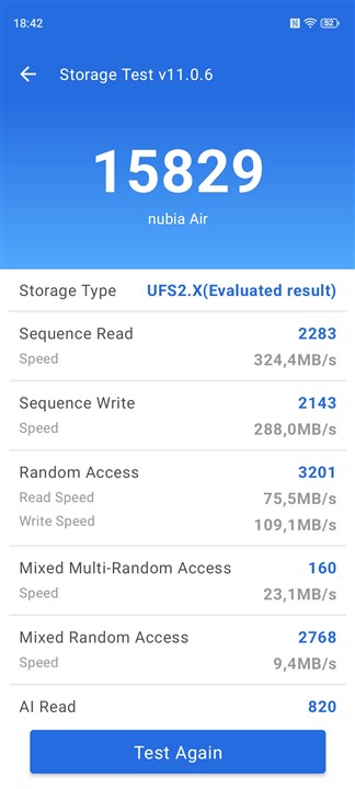 | AnTuTu Storage Test v11.0.6 Viteză citire secvențială Viteză scriere secvențială | 15829 puncte 324.4 MB/s 288 MB/s |