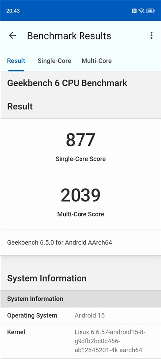| Geekbench 6 v6.5.0 CPU Single-Core CPU Multi-Core | 877 puncte 2039 puncte |