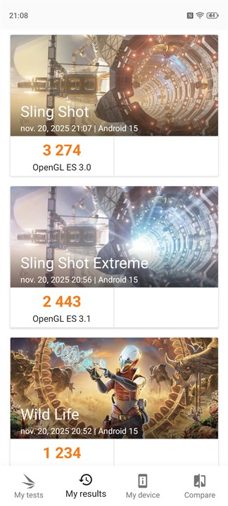 | 3DMark Wild Life Vulkan Wild Life Extreme Vulkan Steel Nomad Light Vulkan Sling Shot Open GL 3.0 Sling Shot Extreme Open GL 3.1 | 1234 puncte 351 puncte 142 puncte 3274 puncte 2443 puncte |