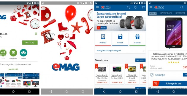 Aplicația de Android a eMAG.ro are 4.90 MB și are nevoie doar de permisiunea de a accesa fotografiile de pe device. Mi-a plăcut designul, viteza cu care navighezi prin meniu, organizarea intuitivă. Te loghezi cu contul tău și poți face comenzile într-un ritm alert.